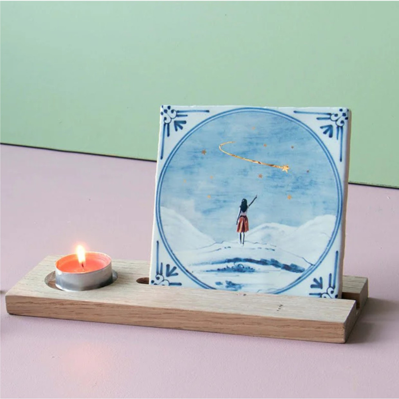 Alle tegeltjes hebben een ophanghaakje achterop. Je kunt je tegel dus meteen een mooi plekje geven. Of je kiest voor een mooie handgemaakte tegelhouder van Doing Goods, handgemaakt van goudkleurig messing.