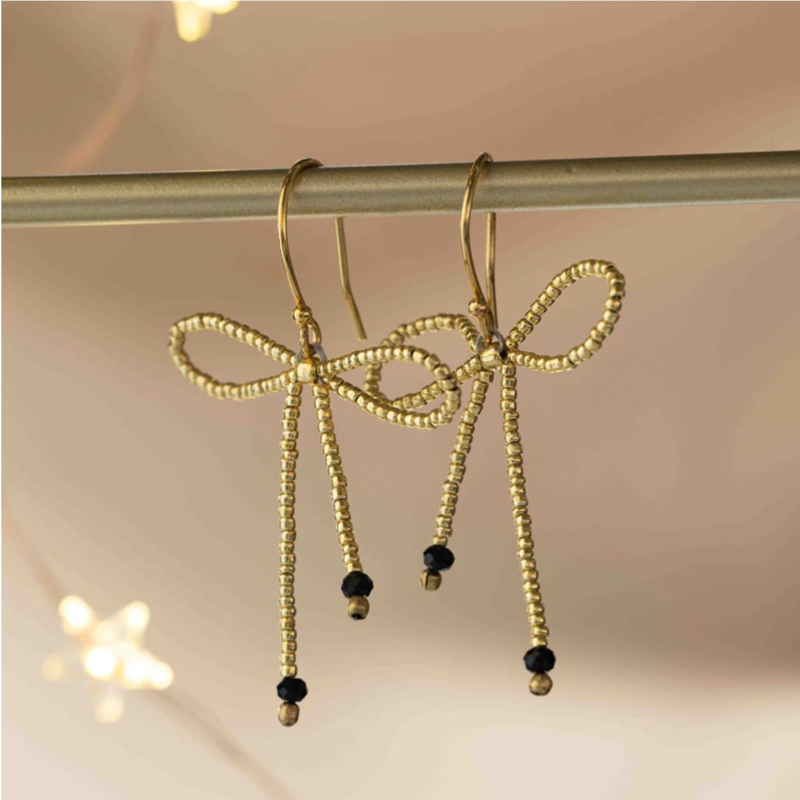 OverzichtDe Bow Zwarte Onyx oorbellen van A Beautiful Story zijn handgemaakt van verfijnde goudkleurige glaskralen en een cute strikdetail. Aan de uiteinden van de strikjes hebben de oorbellen facetgeslepen zwarte onyx edelstenen. 100% party proof!