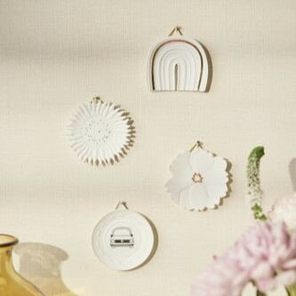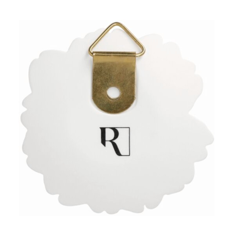 OverzichtWit porseleinen wandbordje van Räder in de vorm van een bloem. Het hart van de bloem is handbeschilderd met goudkleurige stipjes.