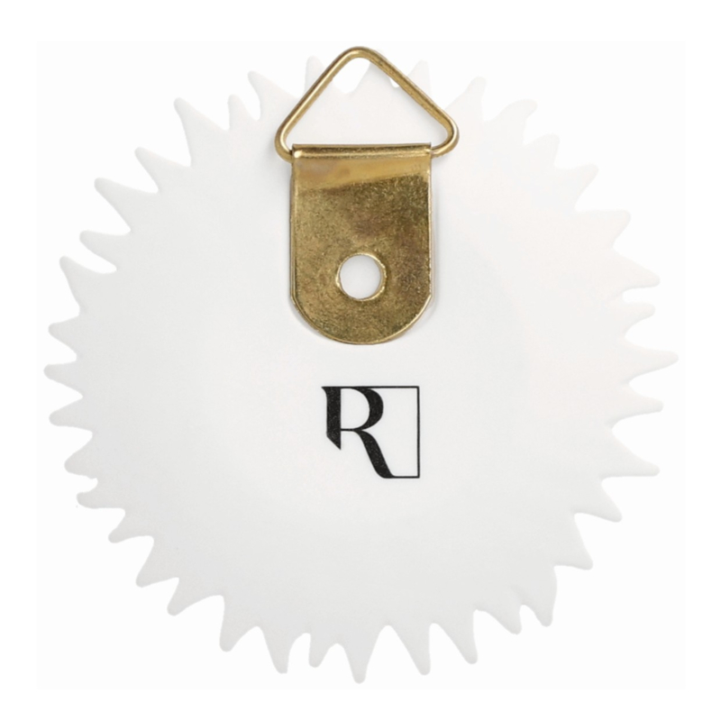 OverzichtWit porseleinen wandbordje van Räder in de vorm van een zon. Het midden van de zon is handbeschilderd met goudkleurige stipjes.