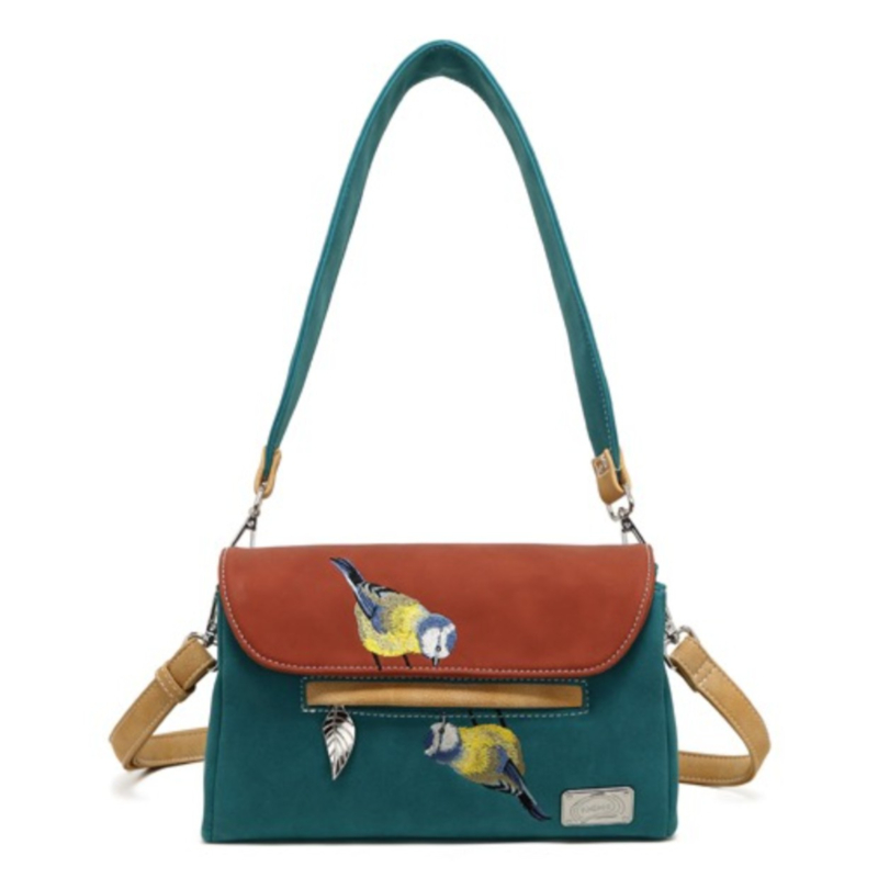 OverzichtSchoudertas / clutch van het Nederlandse merk Hi-di-hi, met een prachtig fijn geborduurde pimpelmees. De tas heeft een hoofdvak met een ritssluiting en binnenin drie aparte vakken, waarvan een met rits. Zowel aan de voor- als achterzijde heeft de tas een vak met rits.