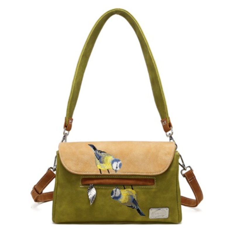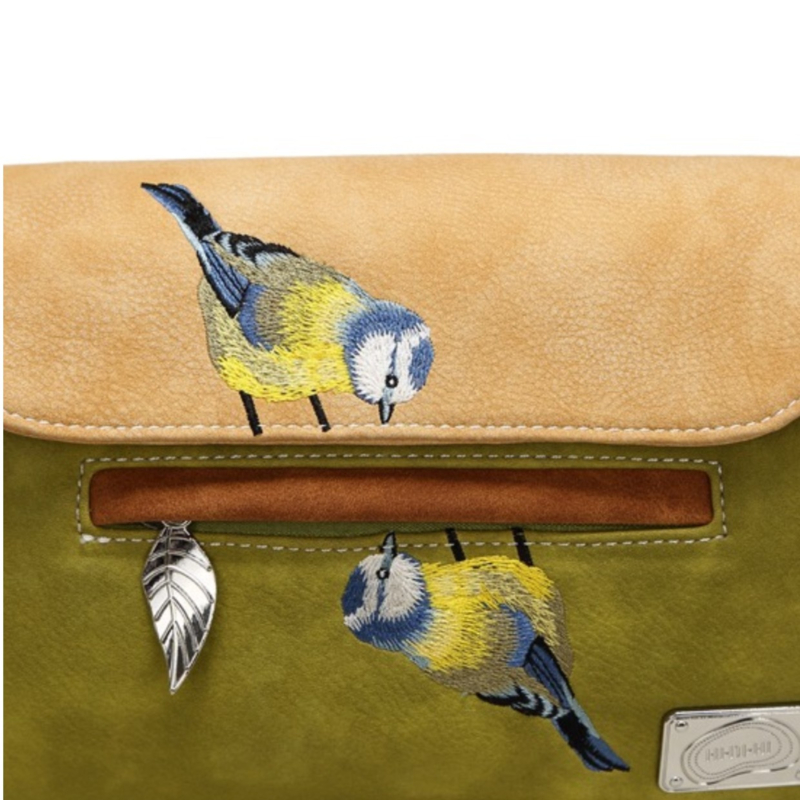 OverzichtSchoudertas / clutch van het Nederlandse merk Hi-di-hi, met een prachtig fijn geborduurde pimpelmees. De tas heeft een hoofdvak met een ritssluiting en binnenin drie aparte vakken, waarvan een met rits. Zowel aan de voor- als achterzijde heeft de tas een vak met rits.