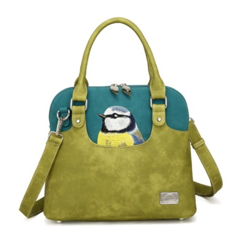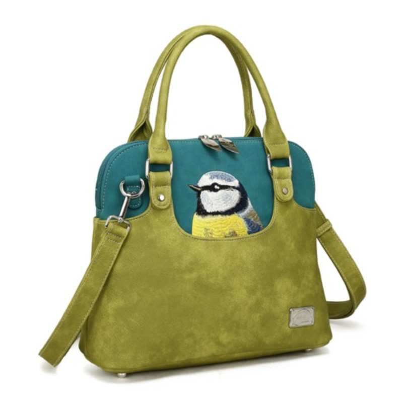 Hand / schoudertas van het Nederlandse merk Hi-di-hi, met een prachtig fijn geborduurde vogel. De tas heeft twee hoofdvakken met rits zowel aan de voor- als achterzijde een insteekvak met magneetsluiting.