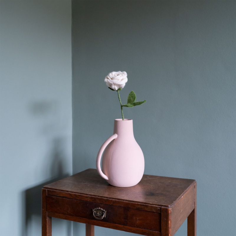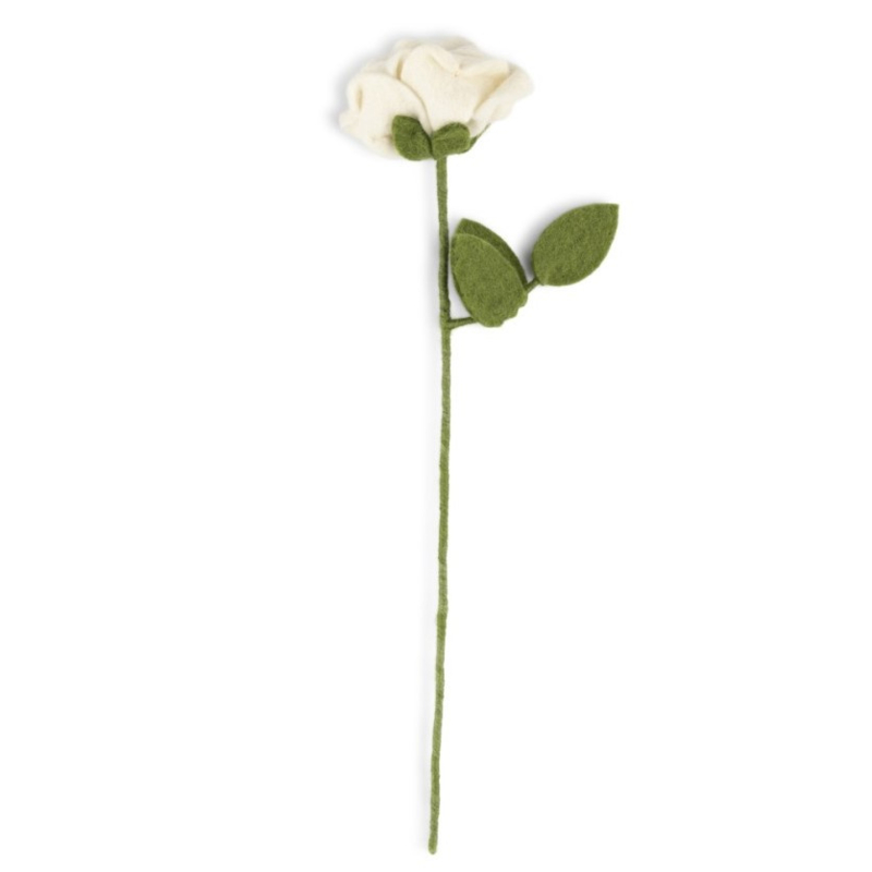 OverzichtVilten roos van Sjaal met Verhaal. In de stengel is metaaldraad verwerkt, zodat de bloem in vorm gebogen kan worden. Leuk in een vaas, als enkele bloem of in een boeket met de andere vilten bloemen van Sjaal met Verhaal.