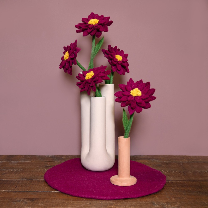 OverzichtVilten dahlia van Sjaal met Verhaal in een mooie magenta kleur. In de stengel is metaaldraad verwerkt, zodat de bloem in vorm gebogen kan worden. Leuk in een vaas, als enkele bloem of in een boeket met de andere vilten bloemen van Sjaal met Verhaal.