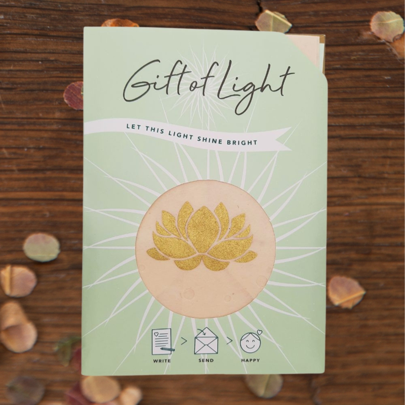 De Gift of Light wenslichtjes zijn gemaakt in Nepal, van handgeschept papier. In het lichtzakje kan een glazen potje met een waxinelichtje, of een LED lampje geplaatst worden. Het licht schijnt sprookjesachtig door het gaatjespatroon en de goudkleurige lotus komt subtiel tot leven.