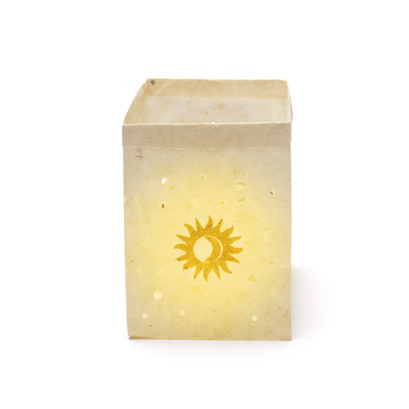 OverzichtDe Gift of Light wenslichtjes zijn gemaakt in Nepal, van handgeschept papier. In het lichtzakje kan een glazen potje met een waxinelichtje, of een LED lampje geplaatst worden. Het licht schijnt sprookjesachtig door het gaatjespatroon en de goudkleurige zon en maan komen subtiel tot leven.