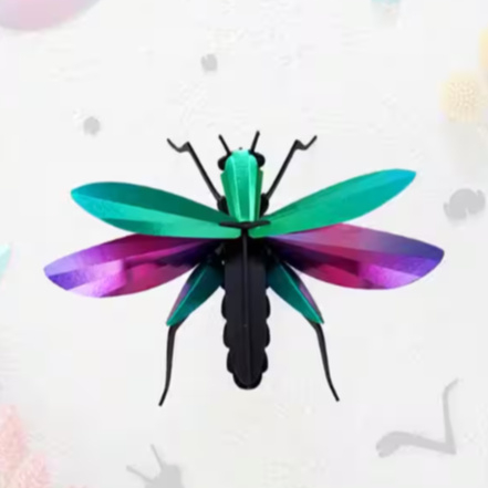 OverzichtMet de DIY kit van Assembli maak je zelf een prachtige 3D sprinkhaan. Het lichaam van de wandelende tak is gemaakt van zwart karton. De schildjes, gemaakt van metallic papier, hebben prachtige kleuren.