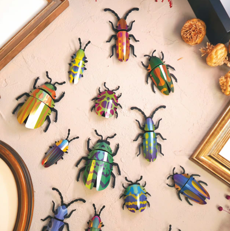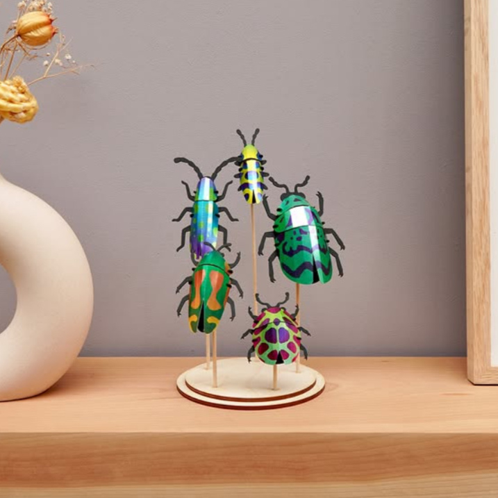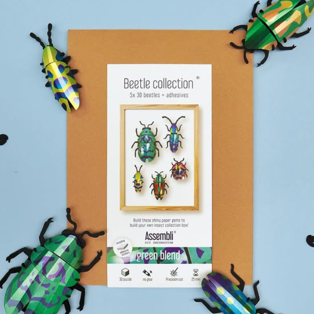OverzichtMet de DIY kit van Assembli maak je zelf een prachtige set van vijf verschillende 3D kevers. Het lichaam van de kevers is gemaakt van zwart karton. De schildjes zijn gemaakt van mooi glossy papier.