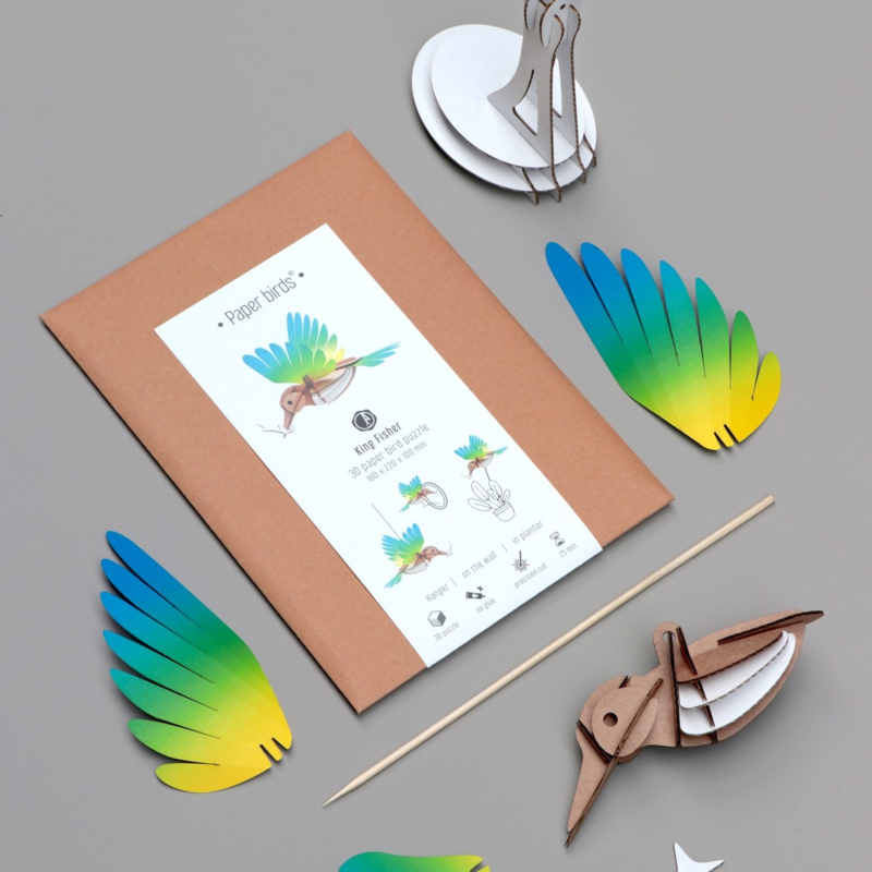 OverzichtMet de DIY kit van Assembli maak je zelf een prachtige 3D ijsvogel. Het lichaam van de ijsvogel is gemaakt van bruin karton. De vleugels zijn gemaakt van mooi glossy papier in prachtige kleuren.